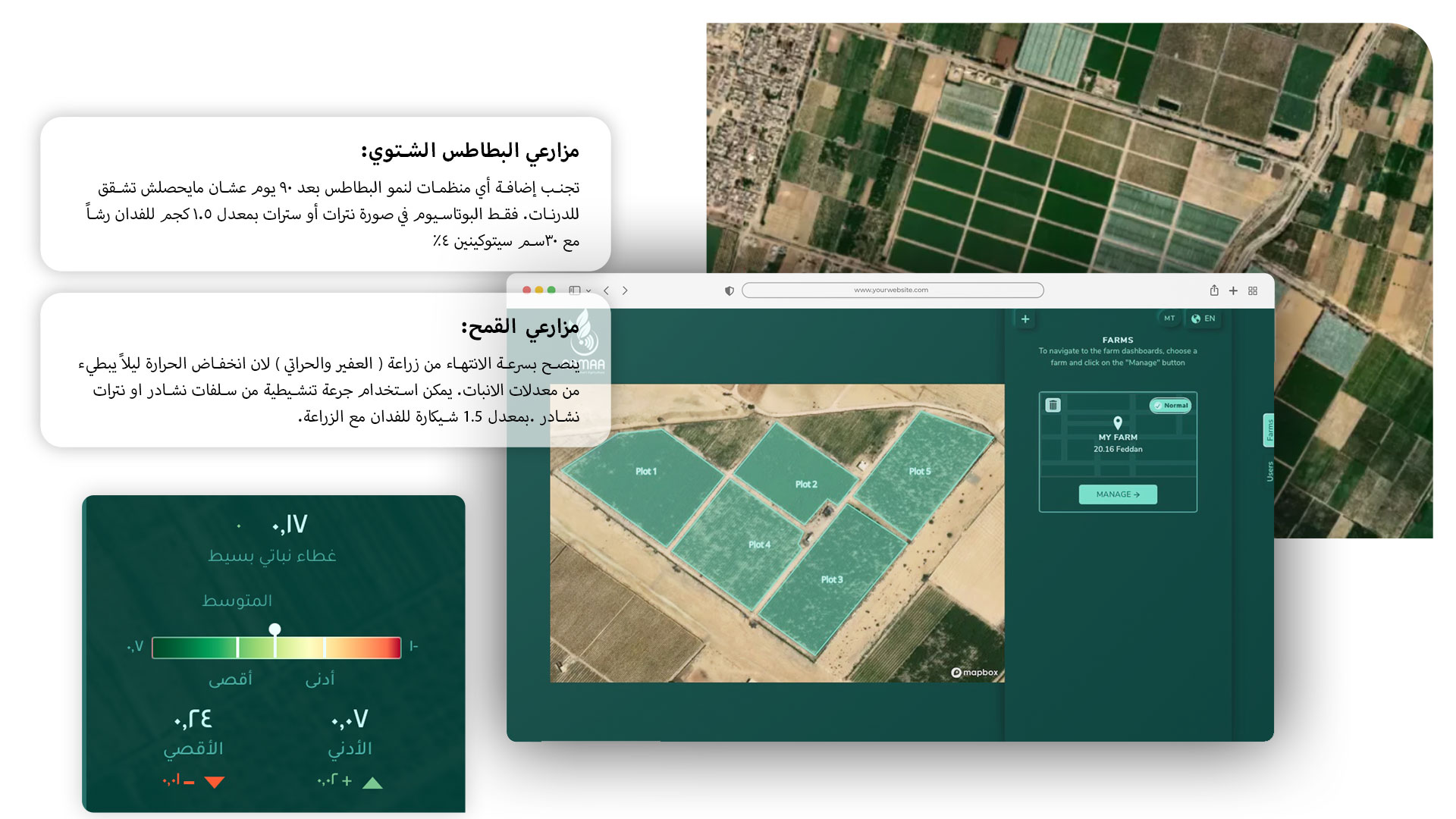 الحل الذكي الأول من نوعه في الشرق الأوسط لتحسين كفاءة واستدامة الممارسات الزراعية باستخدام التكنولوجيا. يهدف التطبيق إلى تمكين المزارعين من إدارة مزارعهم بسهولة وفعالية من خلال دمج البيانات الزراعية الدقيقة وتحليلات النمو الخضري لحقول المزرعة مع حالة الطقس في محيط المزرعة