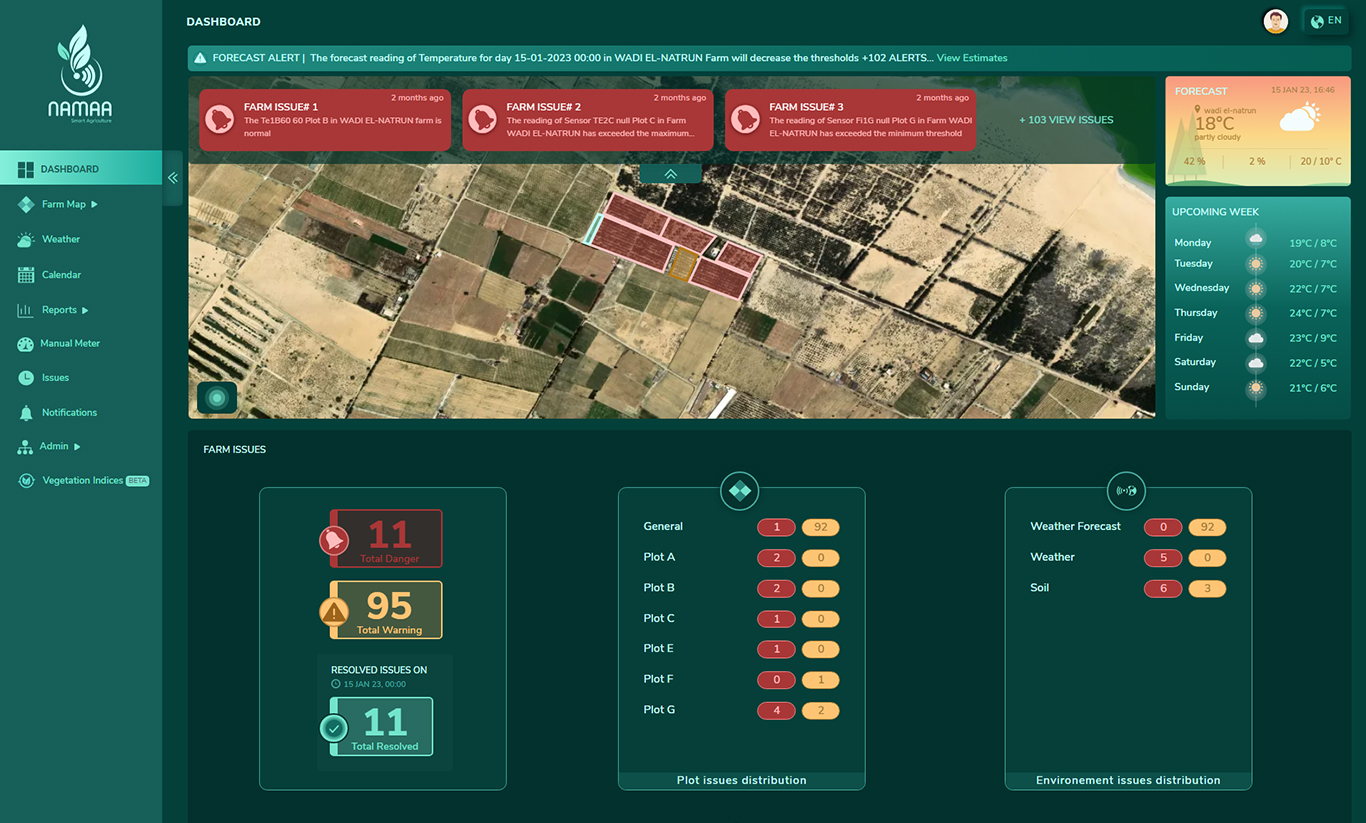 Technology has become a significant cornerstone to industries worldwide, businesses small and big have realized that building a sturdy IT infrastructure is not a wasteful investment, but rather an opportunity to extend their business growth and development. Agriculture is by no means alienated from his market perception, as the agriculture market continues to face numerous challenges, many of which staying on top of real-time information has been prominent. In order to resolve the given farm main challenges, the proposed solution included the deployment of different sensors in the farm, to collect data related to various environmental factors and the farming process employed. With the availability of this data, whether through remote farm monitoring, timely alarm/ warning notifications or farm reporting, users will have access to information that will grant them better farm visibility and effectively enhance their management of the farm. This solution also included the deployment of control components across the existing irrigation system in order to achieve remote and scheduled automatic control of the farm irrigation programs. To facilitate accessibility from any location at any time, NAMAA mobile application was chosen as the main platform used by the farm owners to monitor and control the farm remotely and automatically. NAMAA is a key enabler for maximizing the potential of agricultural resources, driving down costs and building more efficient agriculture systems. Project Objectives